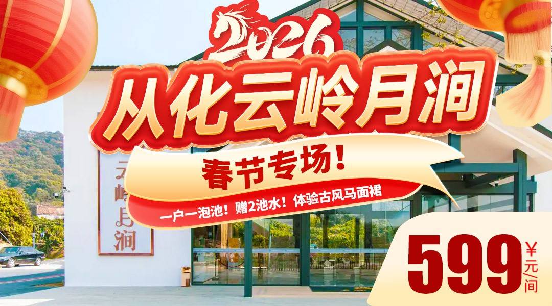 从化春节专场!一户一泡池!赠2池水!2大2小早餐(1.5米以下儿童)¥599起住从化云岭月涧-庭院泡池房,儿童乐园+健身房+阳光大草坪等,体验古风马面裙
