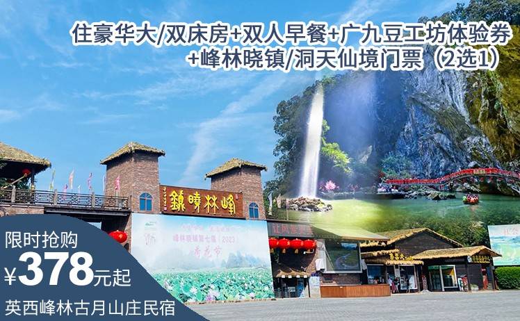 【峰林晓镇/洞天仙境门票2选1】378元抢英西峰林古月山庄民宿特惠套餐,住豪华大/双床房+双人早餐+峰林晓镇/洞天仙境门票(2选1)+广九豆工坊体验券